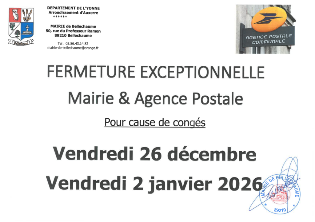 Fermeture exceptionnelle de la mairie et de l’agence postale pour cause de congés